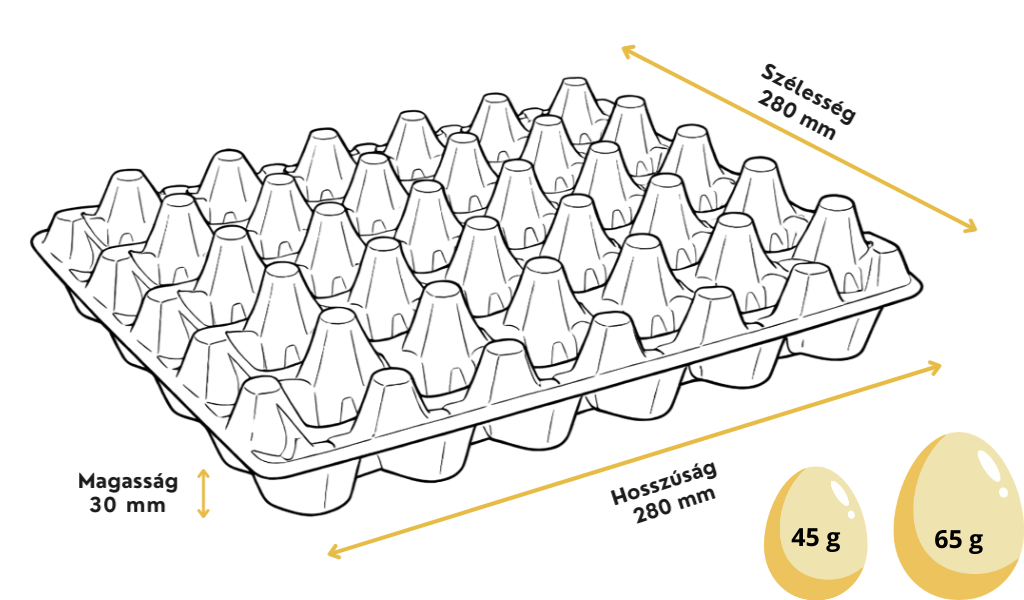| FAMILY PACK 30 tojástálca (30 tojás, 55–65 g) | 300 mm | 260 mm | 38 mm | 120 db | 5280 db | 1200 mm * 800 mm * 2790 mm |